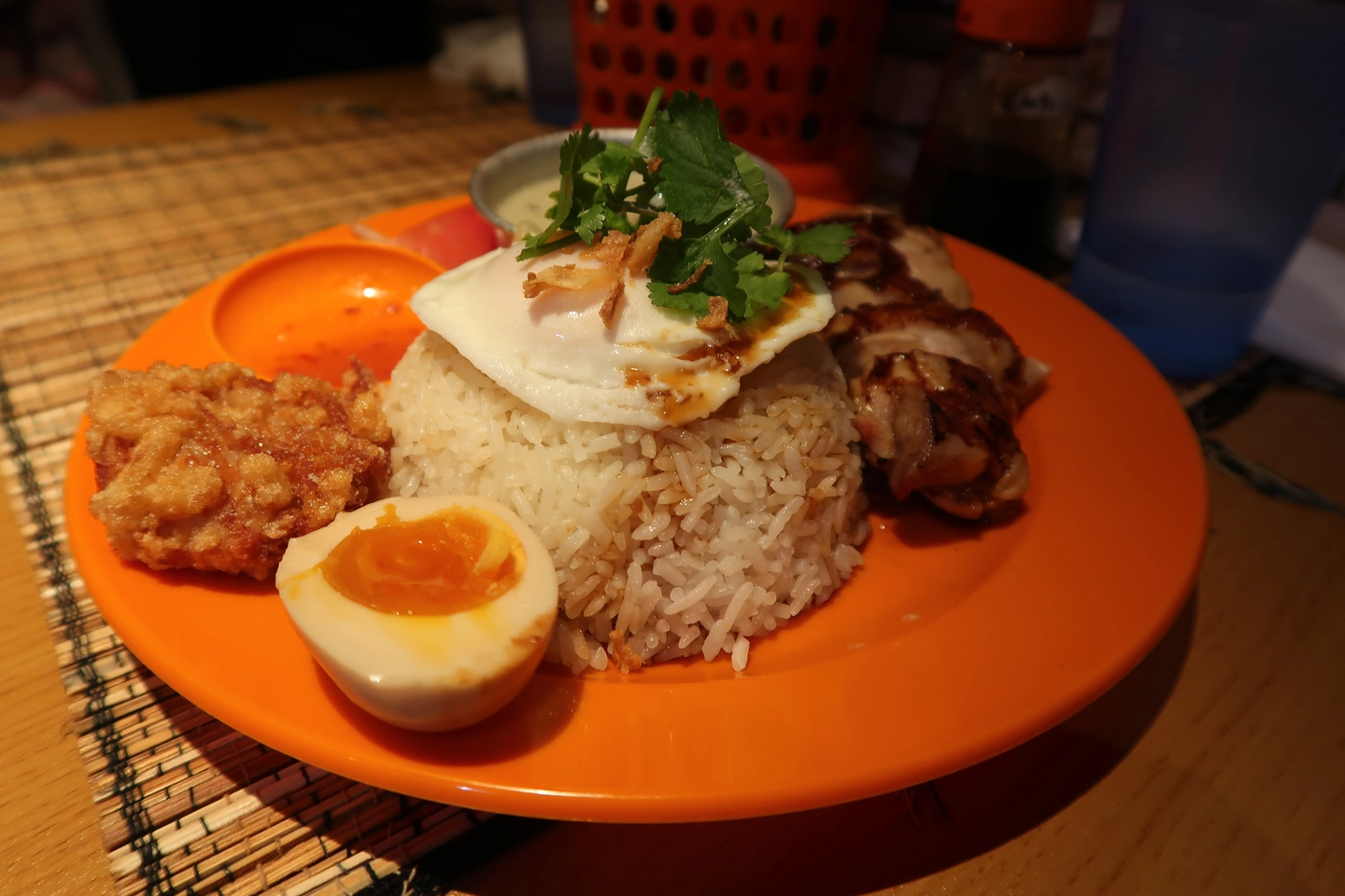お好きな鶏飯に唐揚げ、パクチー、目玉焼き、